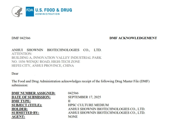 近日,首宁生物科技有限公司(以下简称“首宁生物”)自主研发的 人多能干细胞(hPSC)培养基 已成功通过美国FDA药物主文件(Drug Master File, DMF)备案,备案号:042566。此次备案成功,印证了首宁生物作为细胞治疗核心原材料领先企业在质量控制与国际化合规方面的实力,也凸显了公司在细胞治疗产业链中扮演的关键作用。