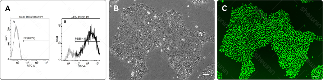 A:EGFPを発現するpPBmPNEEプラスミド2μg(約6.5 kb)をhiPSCにエレクトロポレーションし、トランスフェクション完了24時間後にフローサイトメーターを用いてEGFP陽性細胞を検出。トランスフェクション効率は85.43%に達しました。