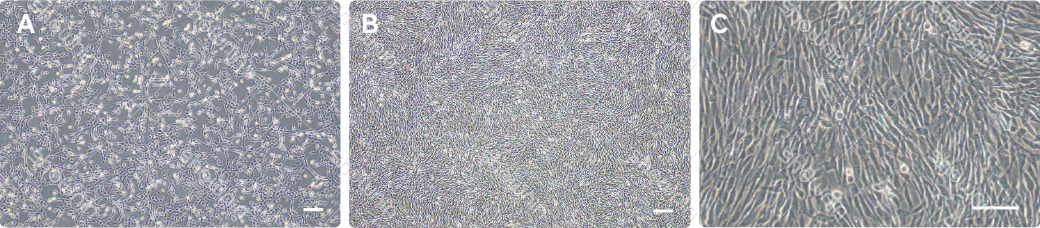 B、C:細胞復元後と継代培養後3日目における顕微鏡下でのhMSCの形態図示。スケール:200μm。