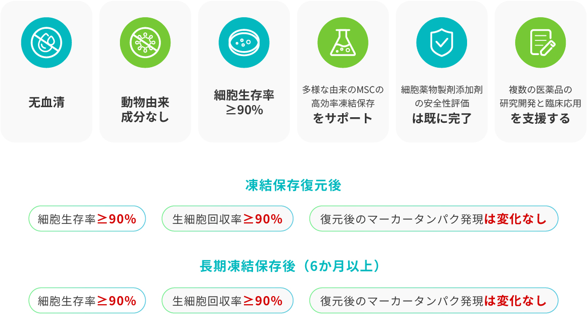 製品特徴:即用型であり、DMSO含有量が少ない。安全かつ高効率で、すべての成分が医薬用グレードまたは添加剤グレードで構成。細胞薬物製剤添加剤の安全性評価は既に完了。臨床グレード/医薬品グレードの細胞培養および凍結保存をサポート。