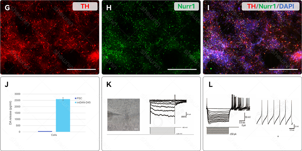 G、H、I:成熟中脳ドーパミン作動性ニューロン(mDAN、40日目)の細胞蛍光図示。 スケール:200μm。