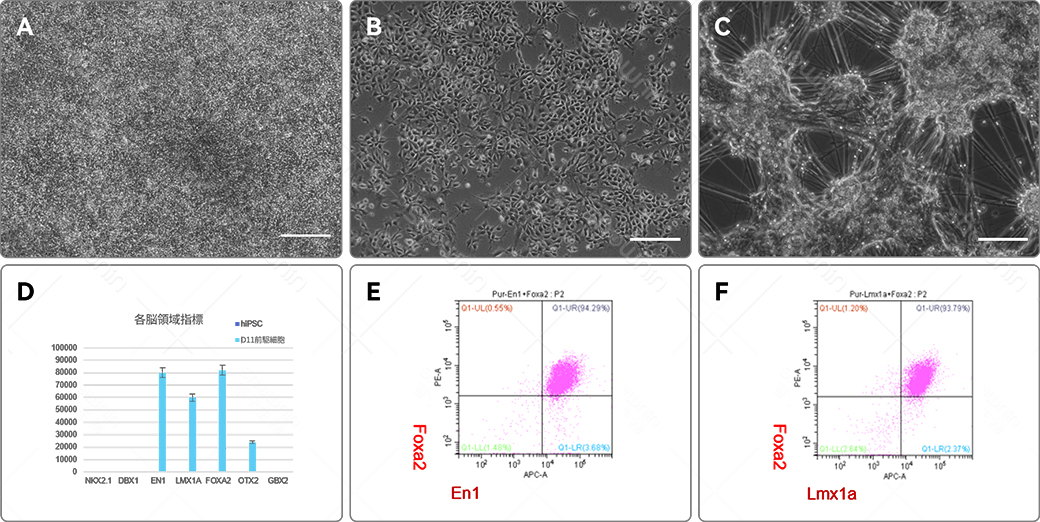 A、B、C:hPSC-ドーパミン作動性神経前駆細胞分化キットを用いた分化プロセスでの11日目、12日目、45日目の細胞形態図示。スケール:200μm。