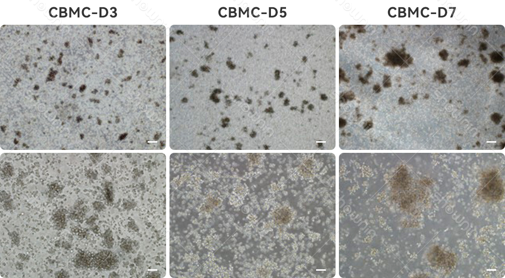 NKVita免疫細胞無血清培地とShownin製NK増幅キット(RP03030)を併用した臍帯血由来NK増殖の細胞図示。スケールバー:200μm
