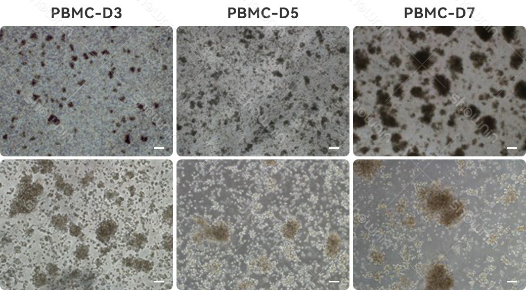 NKVita免疫細胞無血清培地とShownin製NK増幅キット(RP03030)を併用した末梢血由来NK増殖の細胞図示。スケールバー:200μm