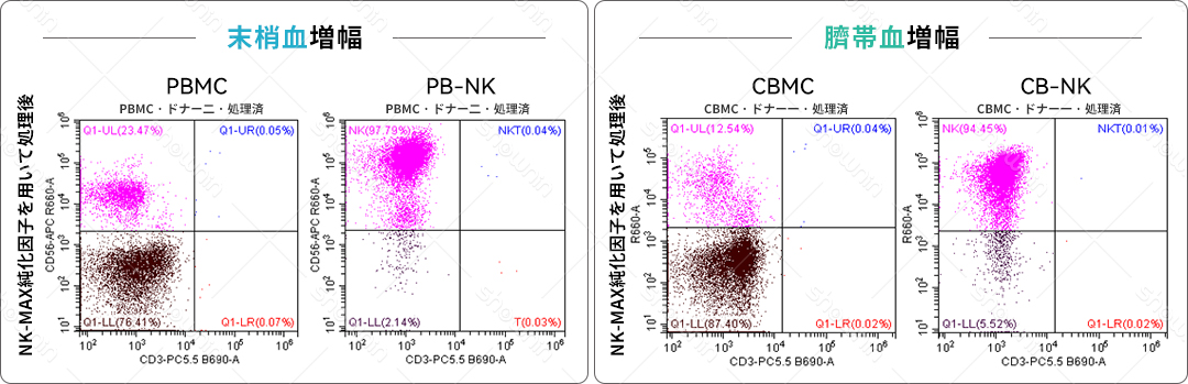 NkVita免疫細胞無血清培地は、NK増幅キット(RP03030)とNK-MAX純化因子(SN-03-0050)を併用することで、末梢血と臍帯血サンプルからのNK細胞が増殖可能で、高純度(CD3-CD56+>90%)のNK細胞を収穫できます。